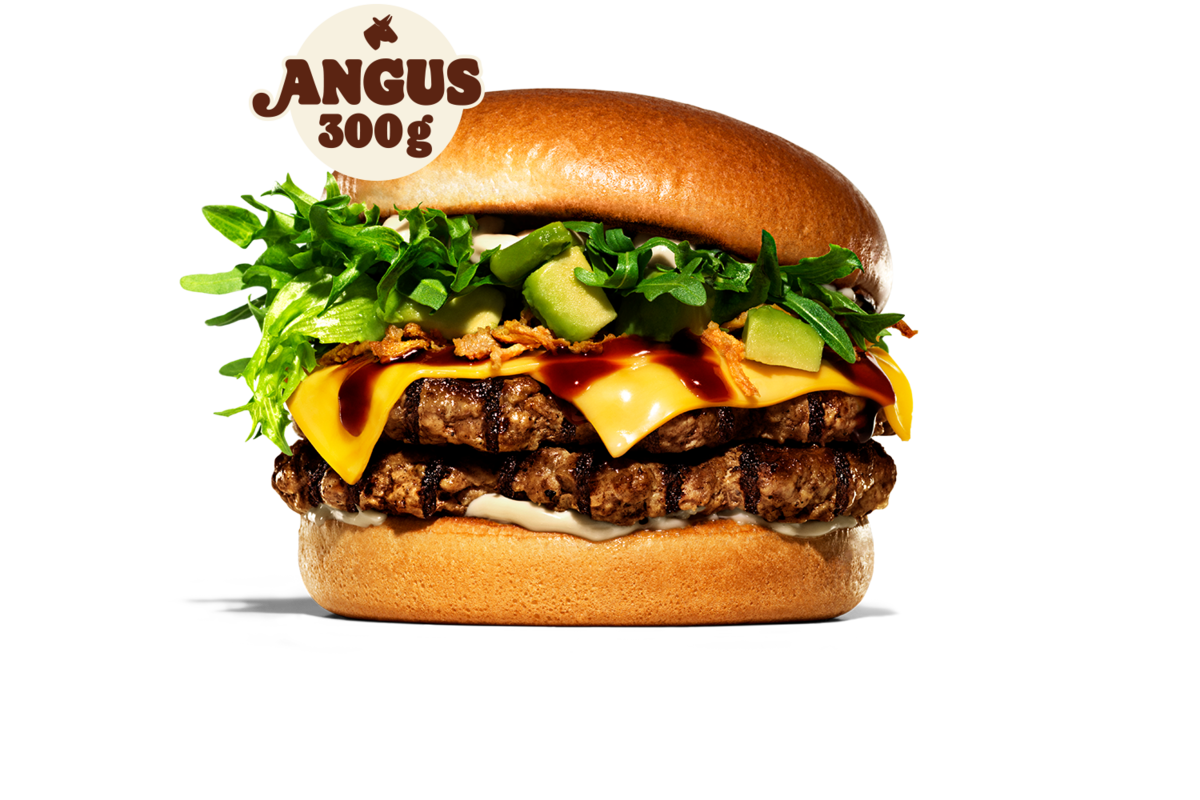 Lyxiga och spännande smaker inspirerade av Japan; black garlicmajonnäs, avocado, cheddarost, rostad lök, teriyakisås och frisée & ruccola-mix. Med 300g anguskött.