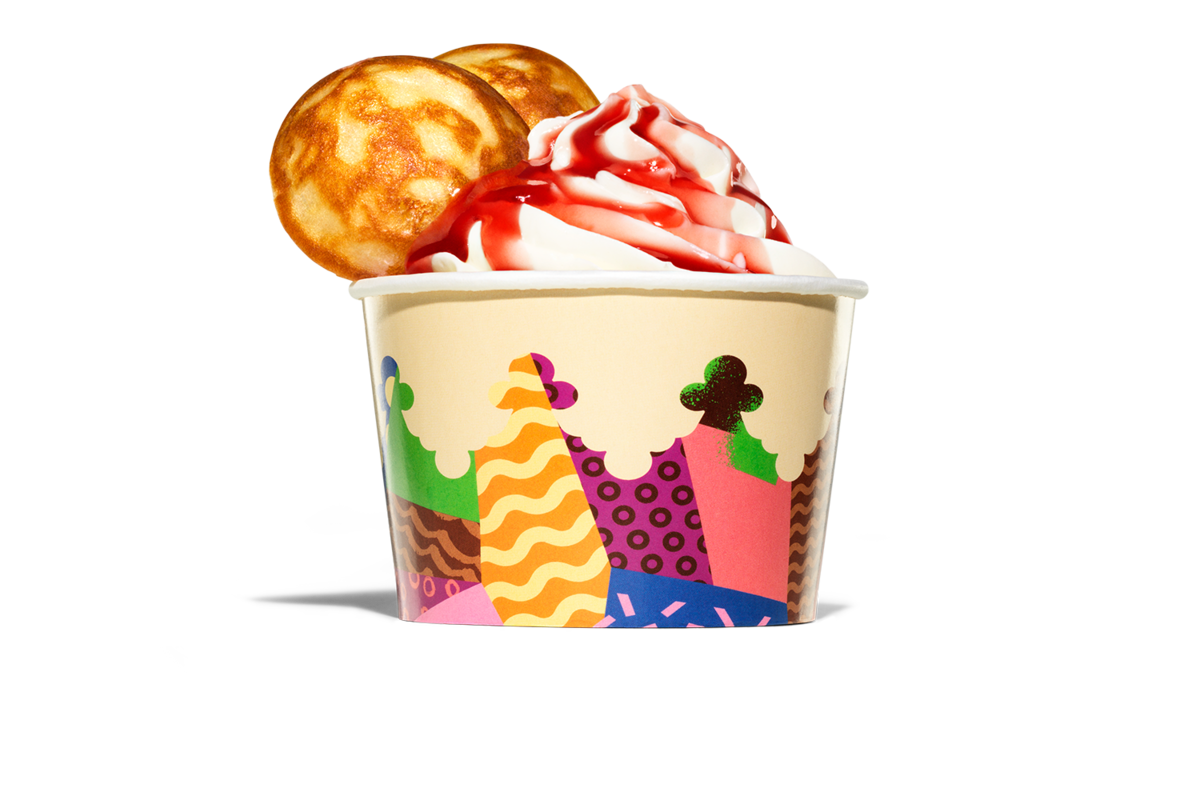 Sundae-mjukglass med två mini-pannkakor och valfri sås* (kolasås, jordgubbssås eller chokladsås).