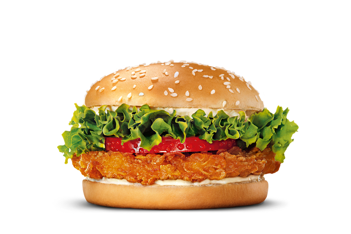 En friterad kycklingburgare med krispig sallad, tomater och dressing.
