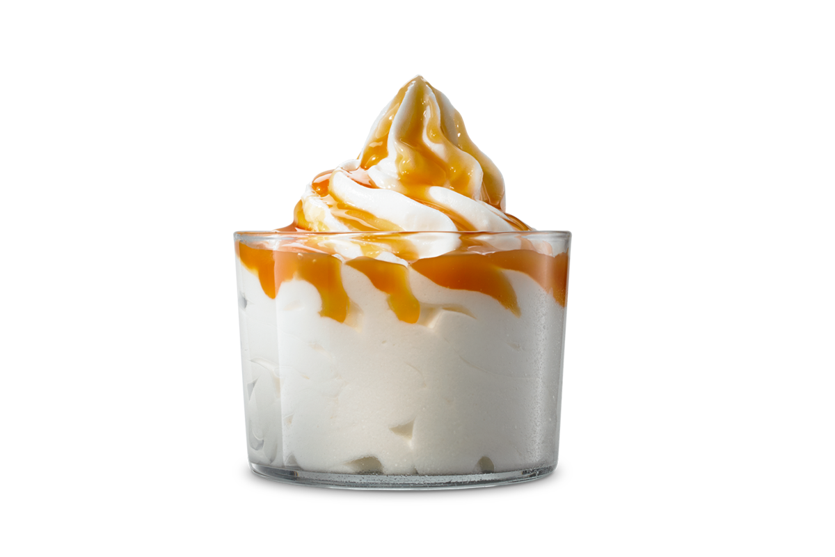 Krämig mjukglass serverad med jordgubbs-, kola- eller chokladtopping.