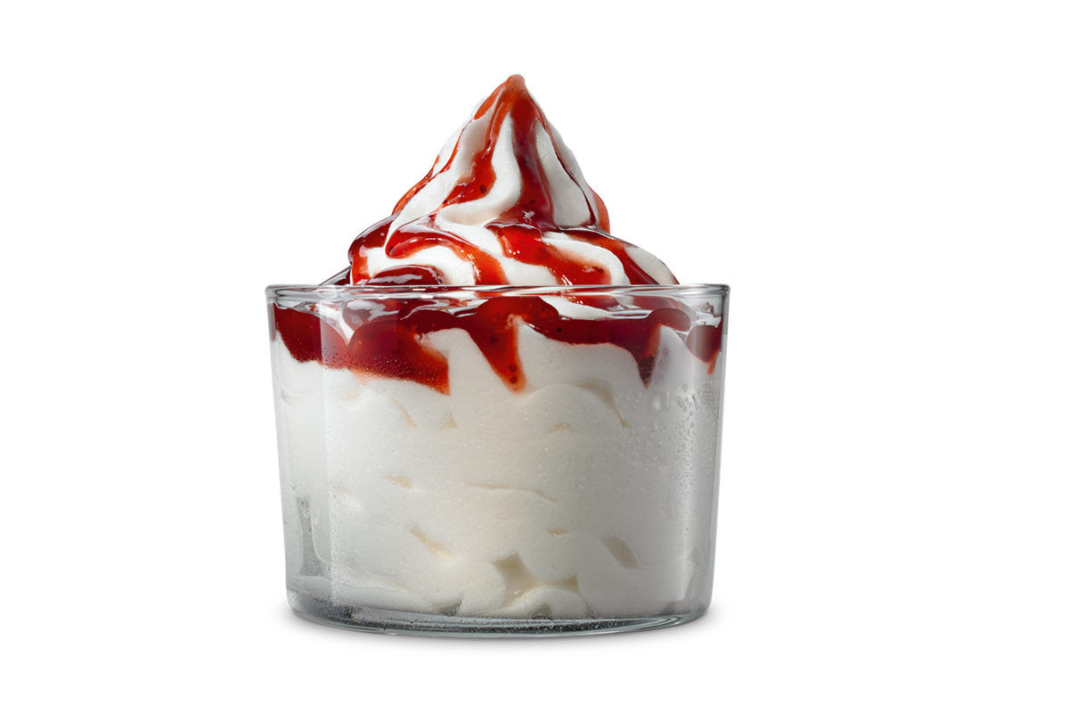 Krämig mjukglass serverad med jordgubbs-, kola- eller chokladtopping.