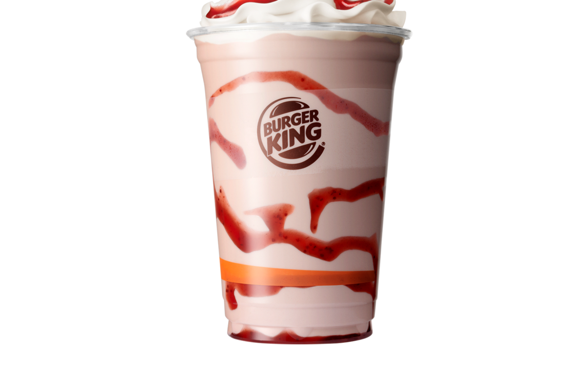 Frisk och härlig jordgubbsshake med ringlad jordgubbssås och luftig grädde.